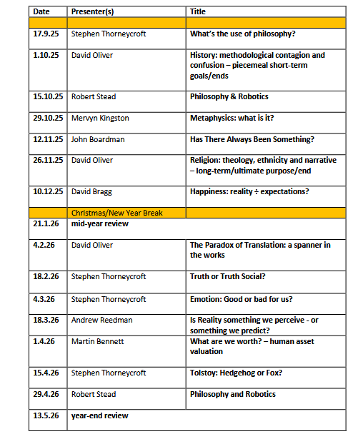 The Philosophy group welcomes all who are interested in understanding the important ideas which underlie current issues and timeless questions. We examine issues using the work of current thinkers and consider the influence of great philosophers and key ideas from the past. We do not take ourselves too seriously, however. Our approach is to share knowledge and ideas gained from our reading and experience in an entertaining way. This involves talks, debates and small group discussions about stimulating questions and scenarios, so that sessions are interesting and enjoyable for members at all levels of experience.